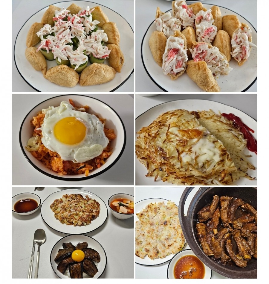 무스비, 에그인헬, 새우볶음밥, 감바스, 오이롤초밥, 김밥, 된장찌개, 가지덮밥, 감자채전, 등갈비, 파닭전, 알밥, 수육, 클럽샌드위치 등..