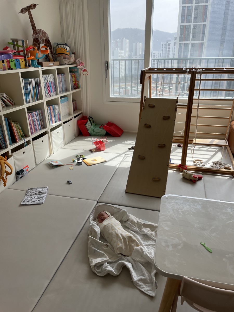 산부인과에서 집에 온 첫날 ㅎㅎ 역시나 첫째 둘째의 흔적이...