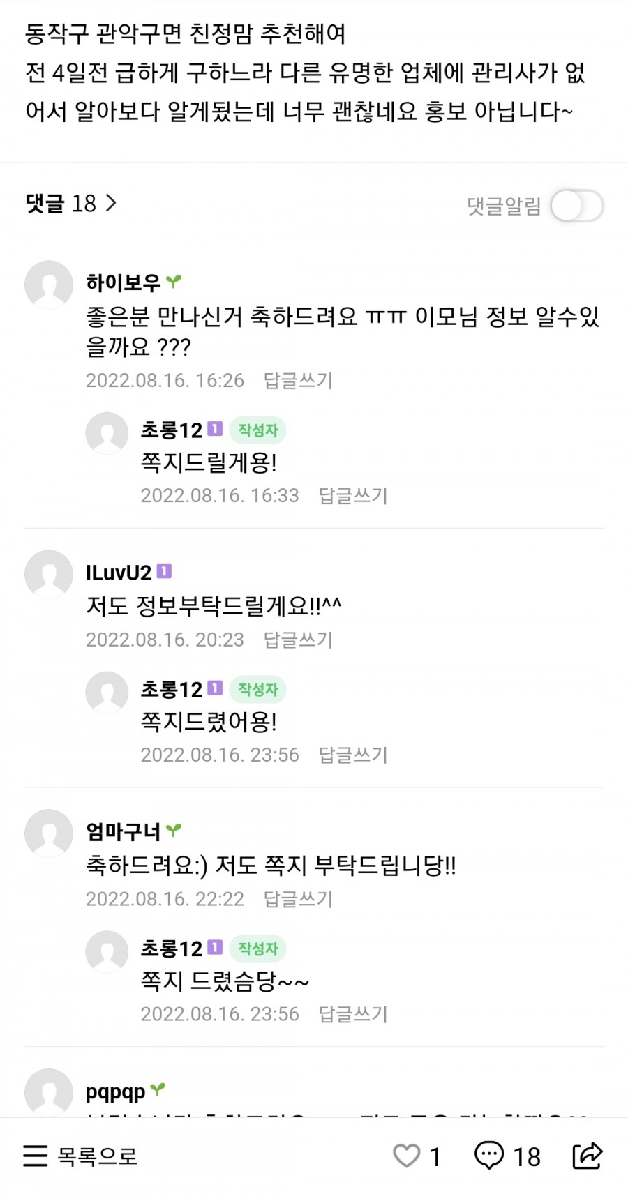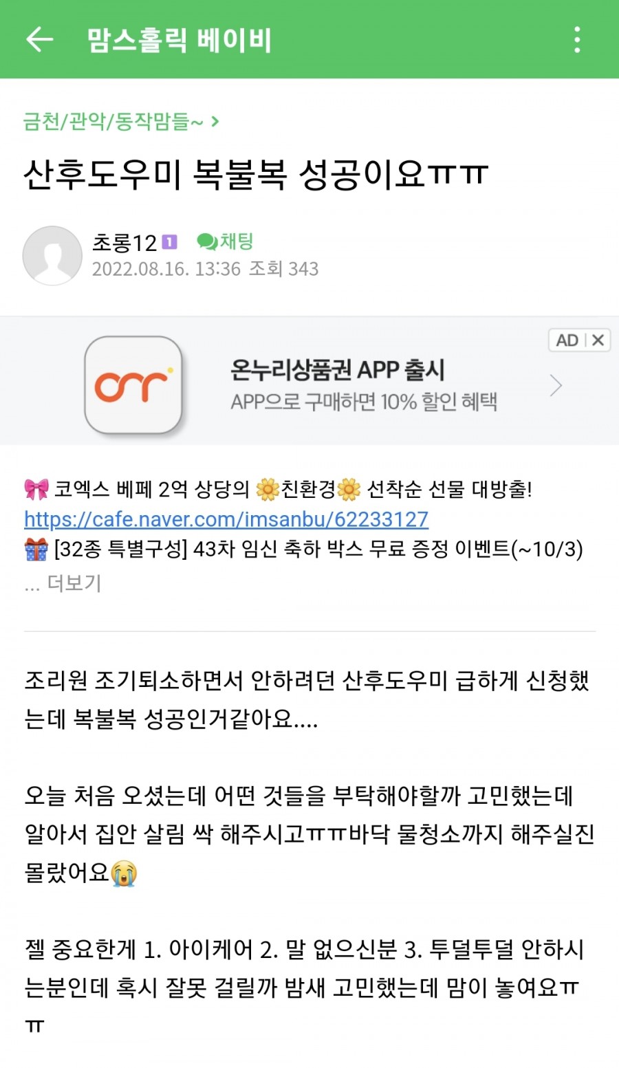 이전글 목록 다음글 수정 삭제 글쓰기 동작구 친정맘 이모님 복 성공!! 조리원 조기퇴소하면서 안하려던 산후도우미 급하게 신청했는데 복불복 성공인거같아요.... 오늘 처음 오셨는데 어떤 것들을 부탁해야할까 고민했는데 알아서 집안 살림 싹 해주시고ㅠㅠ바닥 물청소까지 해주실진 몰랐어요 관리자의 댓글