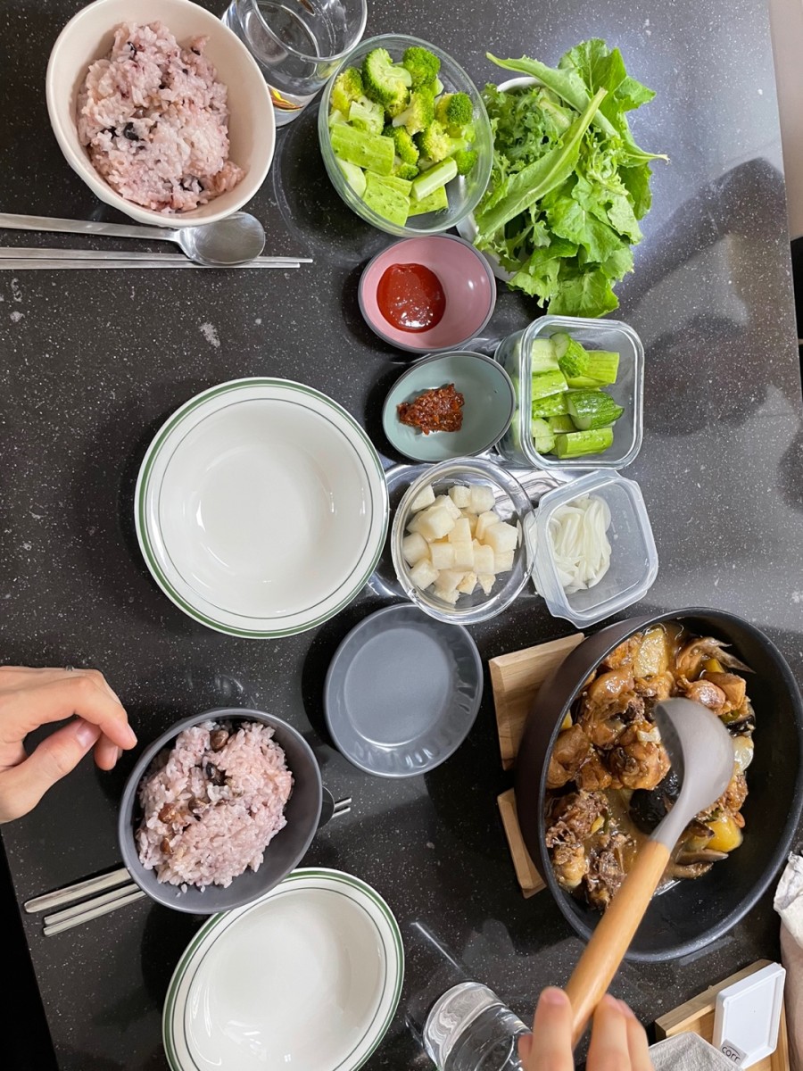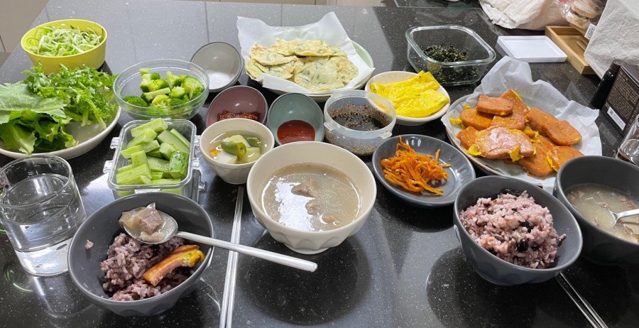 그래서 반찬이 늘 5-6개는 되고 메인 요리 하나에 잡곡밥 국이랑 먹었던 거 같네요.
