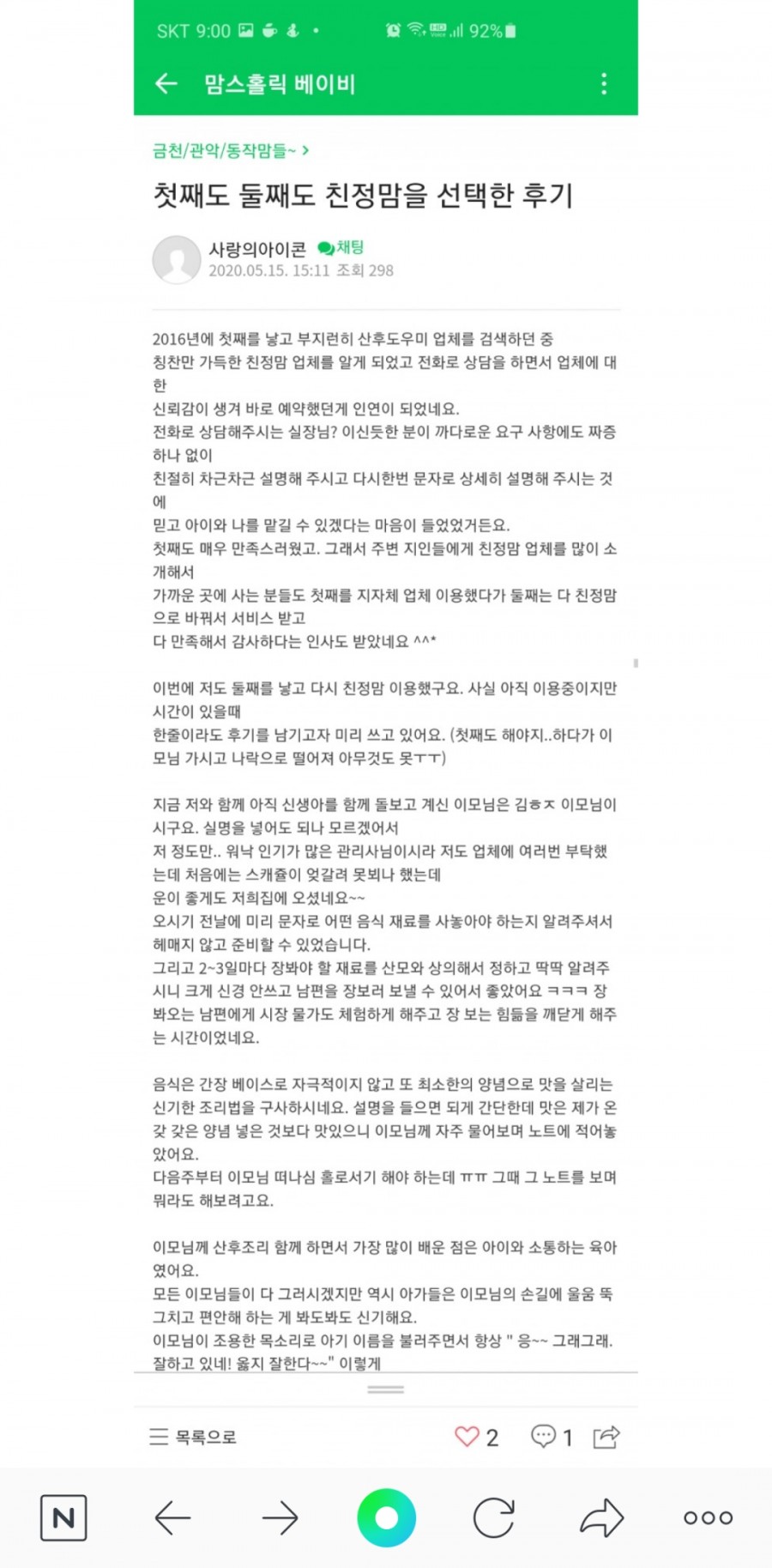 가까운 곳에 사는 분들도 첫째를 지자체 업체 이용했다가 둘째는 다 친정맘으로 바꿔서 서비스 받고